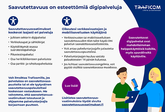 Lain mukaan jokaisella ihmisellä on oikeus antaa palautetta verkkosivuston tai mobiilisovelluksen saavutettavuudesta. Anna palaute suoraan palvelun tarjoajalle eli organisaatiolle, joka on vastuussa sivustosta tai sovelluksesta.